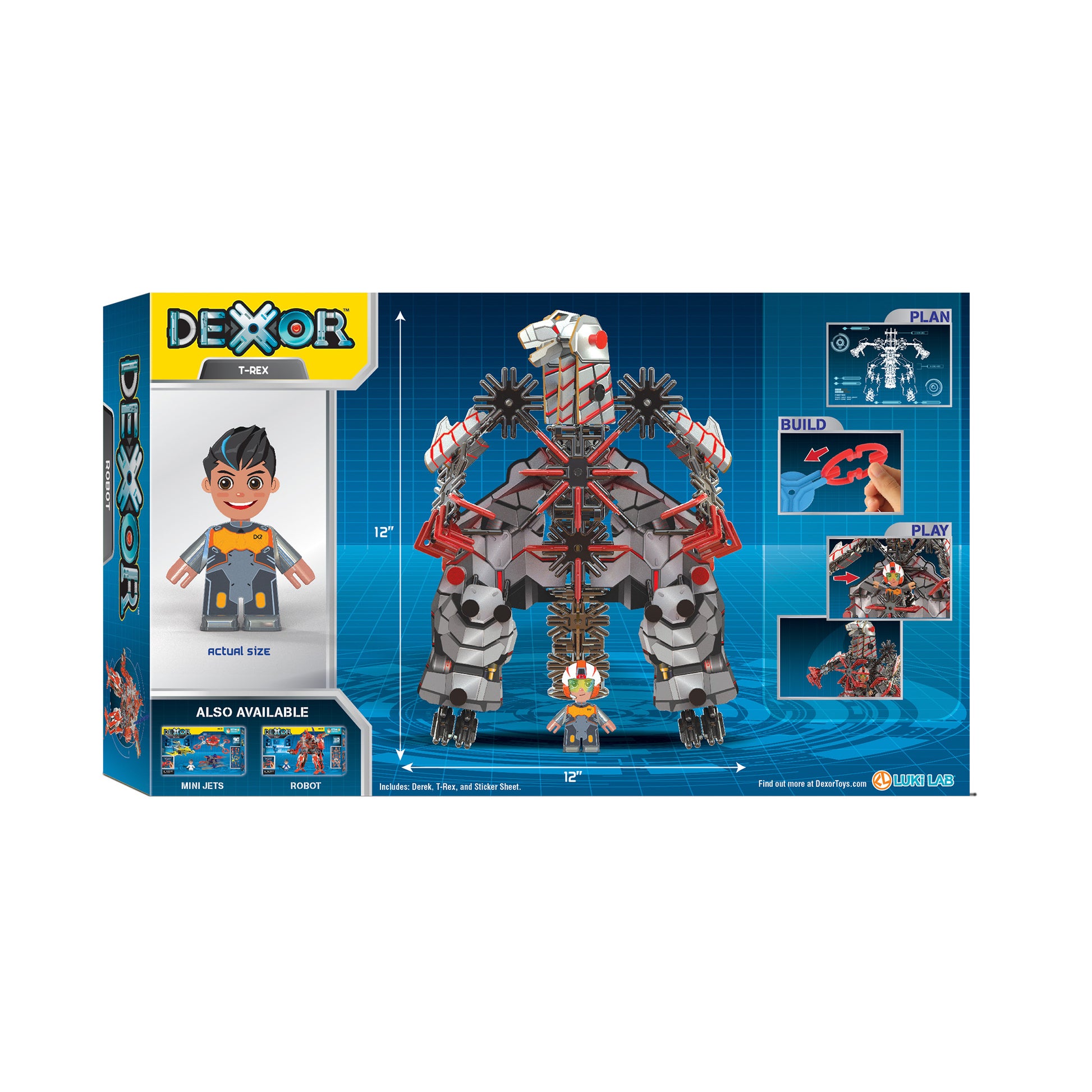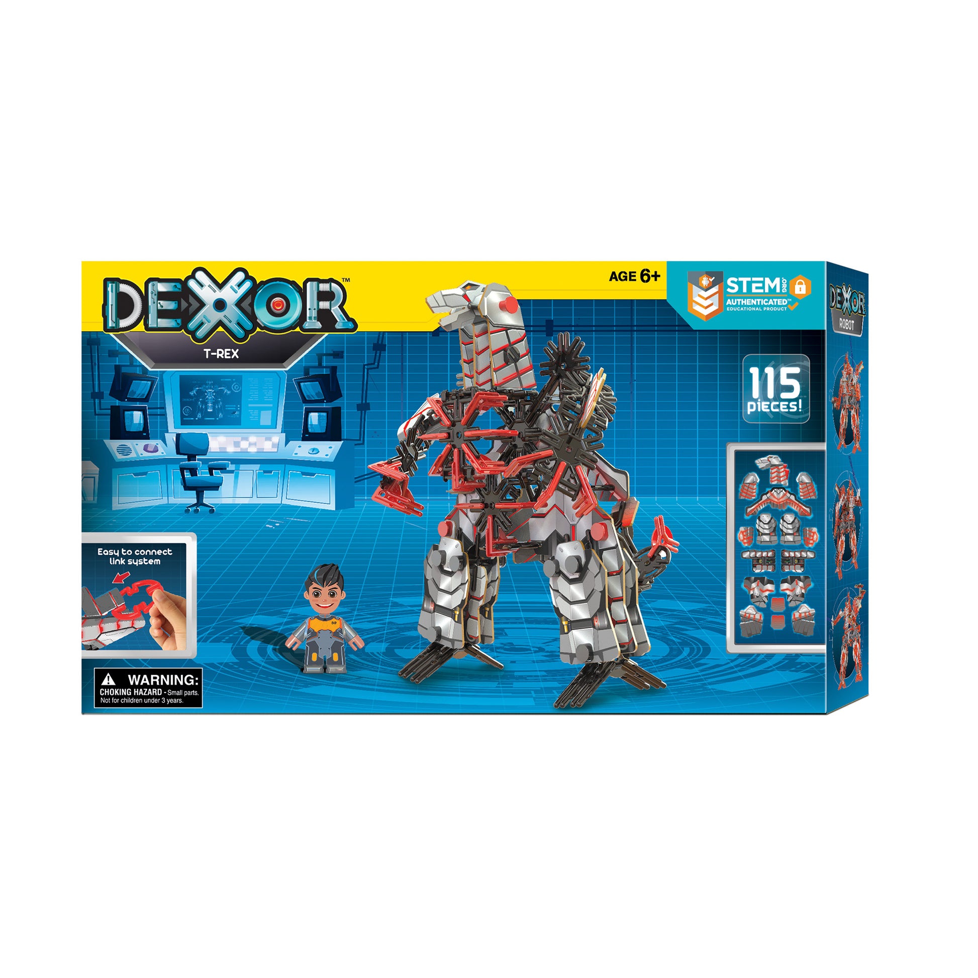 - Each Dexor set features highly detailed graphic paperboard panels and an easy to connect link system featuring bold plastic building links. The Dexor figure also fits inside the T-Rex hatch for added play and storytelling.