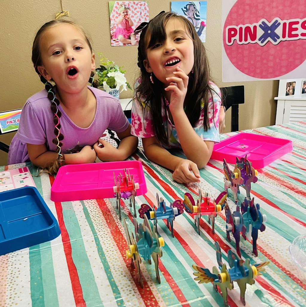 The Unicorn Creation Studio playset includes over 80 pieces including colorful gem stickers for decorating. Also, each Pinxies set features highly detailed graphic paperboard panels and colorful plastic building links for the ultimate building experience.
